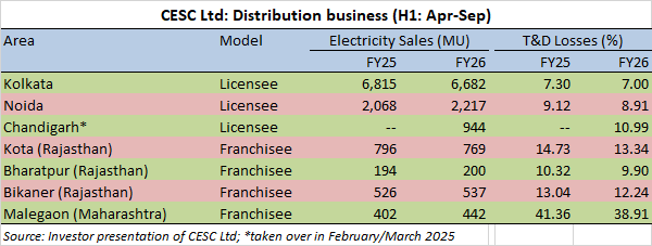 Based on data analyzed from an investor presentation filed on stock exchanges, CESC enjoyed lower T&D losses across its licensed areas of Kolkata and Noida, as well as its franchised operations in Rajasthan and Maharashtra. (See table).