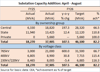 Over half of the new substation capacity added in the first five months of FY26 (April to August) pertained to the 765kV voltage class, implying a major boost to the interstate transmission system (ISTS) network.